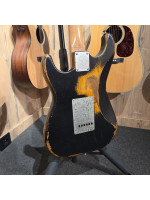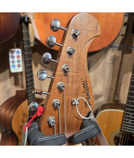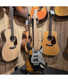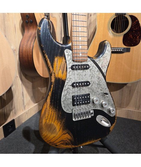 Voici une Alfa Loft HSS - 235 Butterscotch Black - Nickel, équipée d'un manche en érable torréfié canadien, d'un vibrato et d'accastillage Paoletti d'origine.